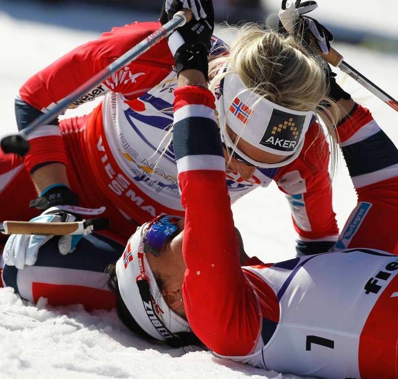 A picture of therese johaug, marit bjoergen.